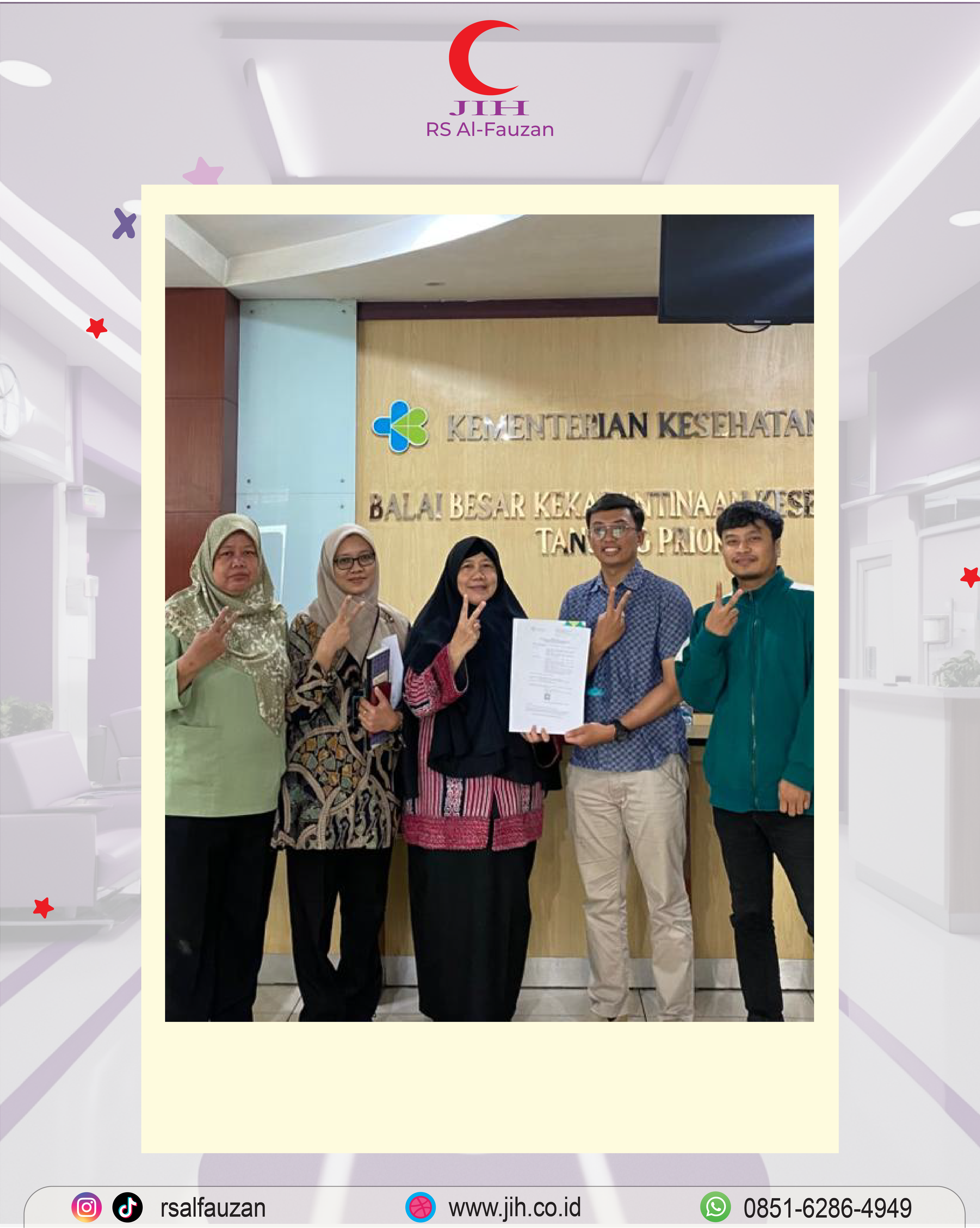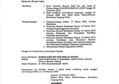 Jakarta, 13 Februari 2026 – Rumah Sakit Ibu dan Anak (RSIA) Al-Fauzan kembali memperoleh persetujuan perpanjangan pelayanan penerbitan Sertifikat Vaksinasi Internasional dari Kementerian Kesehatan Republik Indonesia melalui Balai Besar Kekarantinaan Kesehatan (BBKK) Tanjung Priok.
