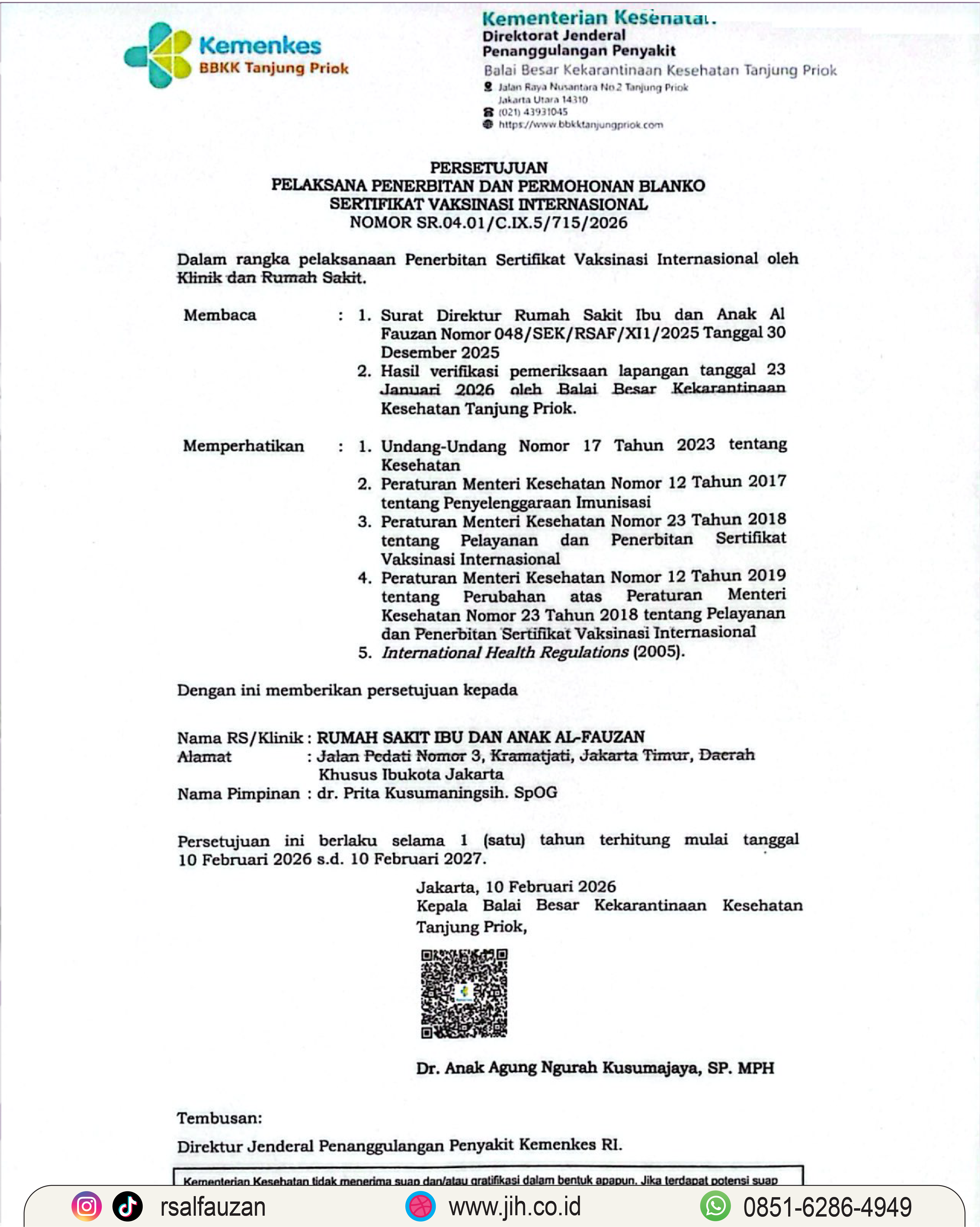 Persetujuan ini berlaku untuk periode 10 Februari 2026 hingga 10 Februari 2027, sebagai bentuk kepercayaan pemerintah terhadap mutu layanan vaksinasi internasional yang diselenggarakan RSIA Al-Fauzan.